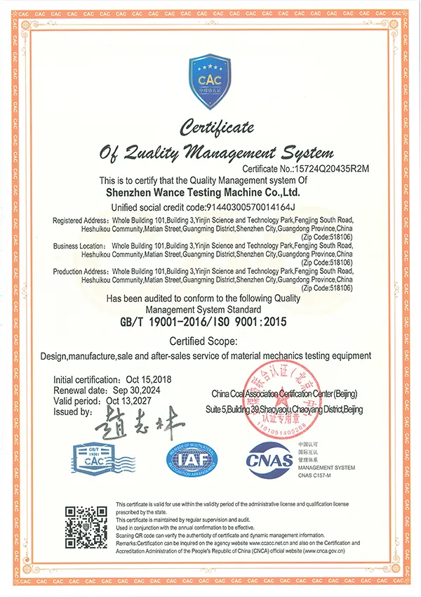 Fundada en 2011, Shenzhen Wance Testing Machine Co., Ltd. es un fabricante especializado en el desarrollo y la producción de equipos de ensayos mecánicos de alta precisión. Contamos con centros de investigación y producción en Shenzhen y una moderna base de fabricación en Wuhan de casi 30,000m², lo que nos permite ofrecer una sólida capacidad productiva y garantizar entregas eficientes a gran escala.